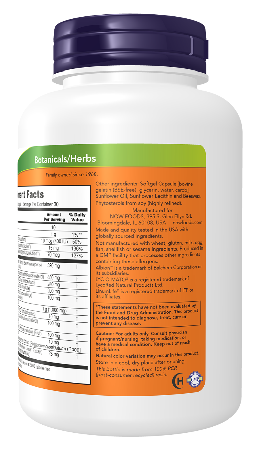 Vitamin D (as D3 Cholecalciferol), Zinc (from Zinc Bisglycinate) (Albion™), Selenium (from Selenium Glycinate) (Albion™), Saw Palmetto Extract (Berry) (Serenoa repens) (min. 85% Fatty Acids), Phytosterols (Plant Sterols) (with Beta-Sitosterol), Stinging Nettle Root Extract (Urtica dioica), Quercetin (from Quercetin Dihydrate), Turmeric Root Extract (Curcuma longa) (min. 95% Curcuminoids), Pumpkin Seed Oil, Lycopene (LYC-O-MATO® Tomato Extract), Green Tea Extract (Camellia sinensis) (Leaf) (min. 50% EGCg), Pomegranate Extract (Punica granatum) (Fruit), Trans-Resveratrol [from Japanese Knotweed Extract (Polygonum cuspidatum) (Root)], LinumLife® Complex (Flax Seed Lignan Extract) (Linum usitatissimum) (Seed Coat) Other Ingredients: Softgel Capsule [bovine gelatin (BSE-free), glycerin, water, carob], Sunflower Oil, Sunflower Lecithin and Beeswax. Phytosterols from soy (highly refined).